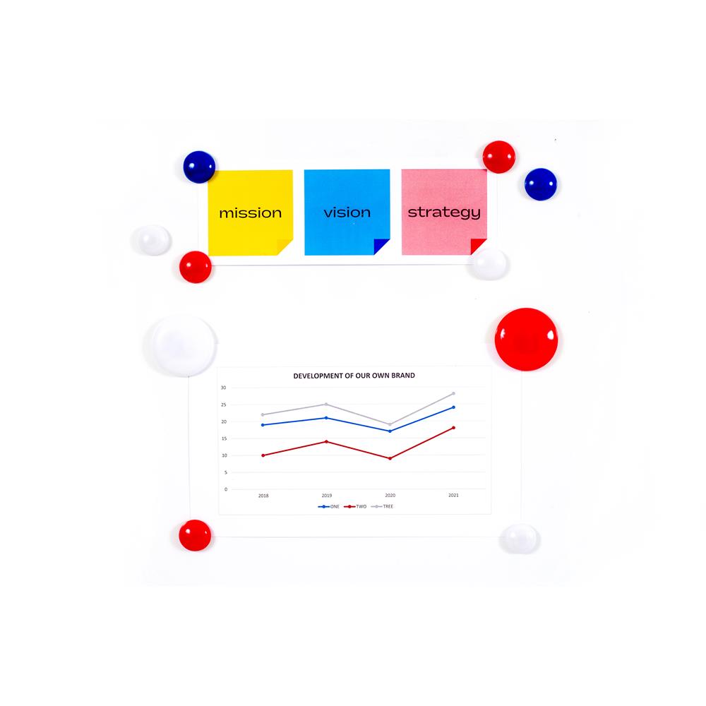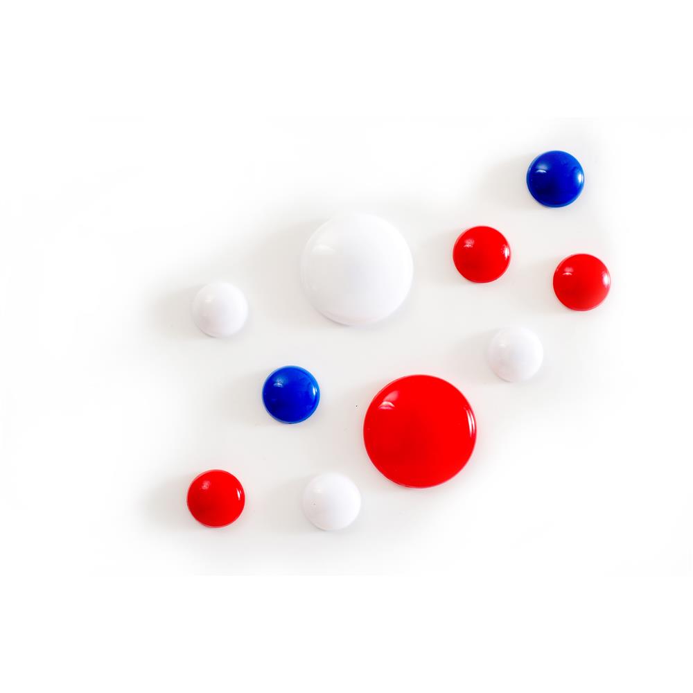 Zestaw okrągłych magnesów do tablic i innych powierzchni magnetycznych. Plastikowa obudowa nadaje magnesom estetyki. Doskonałe wsparcie podczas prezentacji informacji i grafik.